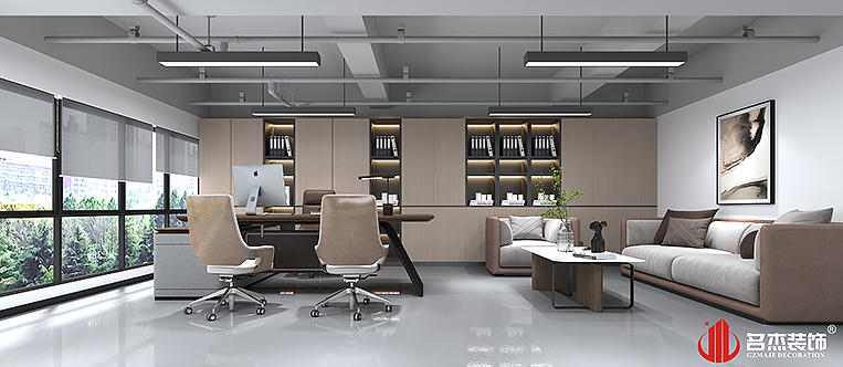 整體辦公裝修設計空間加入了造型柜子來增加空間的層次感,同時也為空間的儲物做出一個不錯的設計。加入不同的造型燈光,可以讓空間中的氛圍感更加有趣。空間也加入了該企業的材料來讓企業文化更加濃郁。