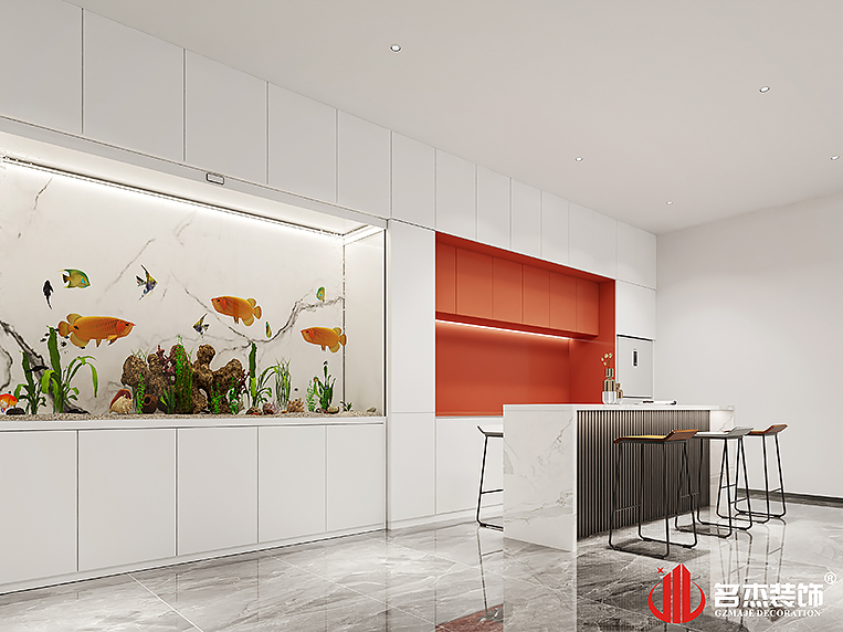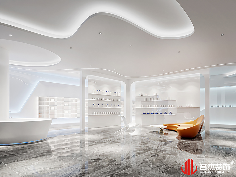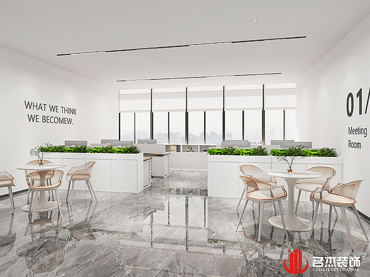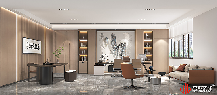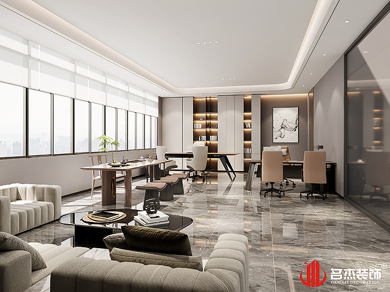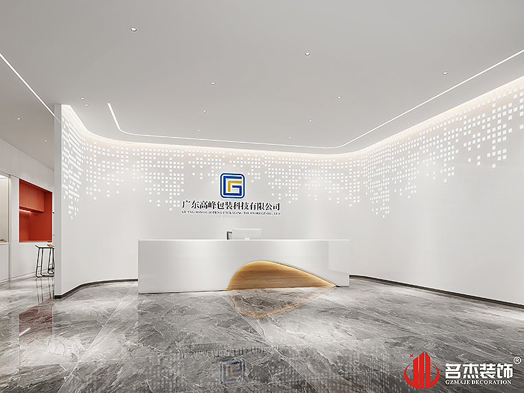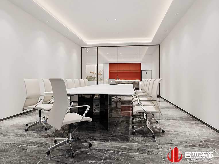 在前臺區域使用沖孔鋁板作為前臺背景的點綴元素,讓傳統的背景墻不再單調,突顯出該企業敢于突破的精神,同時沖孔鋁板和弧形元素的搭配也能夠讓人感到眼前一亮。而且在多個區域中使用Pantone赤色作為點綴色調,讓其辦公裝修設計空間變得更加有亮點。展廳吊頂則是使用線條走向來引導整個動線的設計,讓進入其中的人能夠感受到設計團隊的用心。
