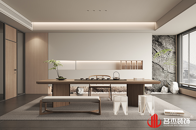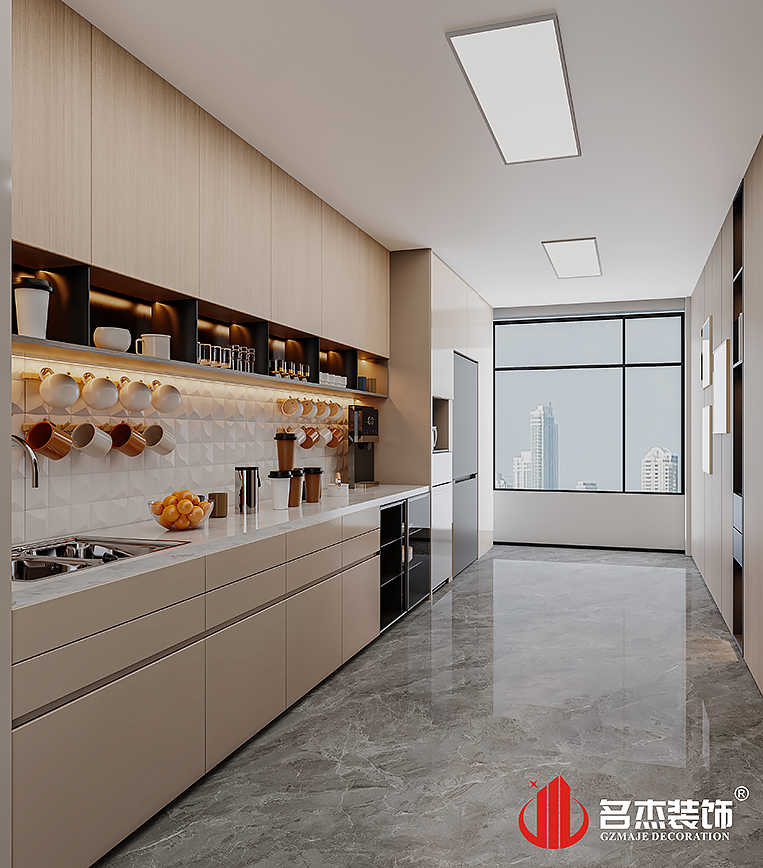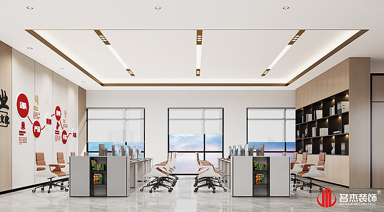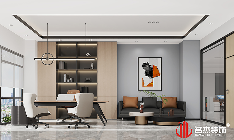 整個辦公空間采用的是時尚簡約風格來打造的,使用傳統的黑白色作為設計的主色調,同時原木色作為點綴元素,讓空間變得更加有特色。全局使用天花吊頂也能夠讓空間整體看起來更加有質感,不同的燈飾也能夠營造出不一樣的氛圍。
